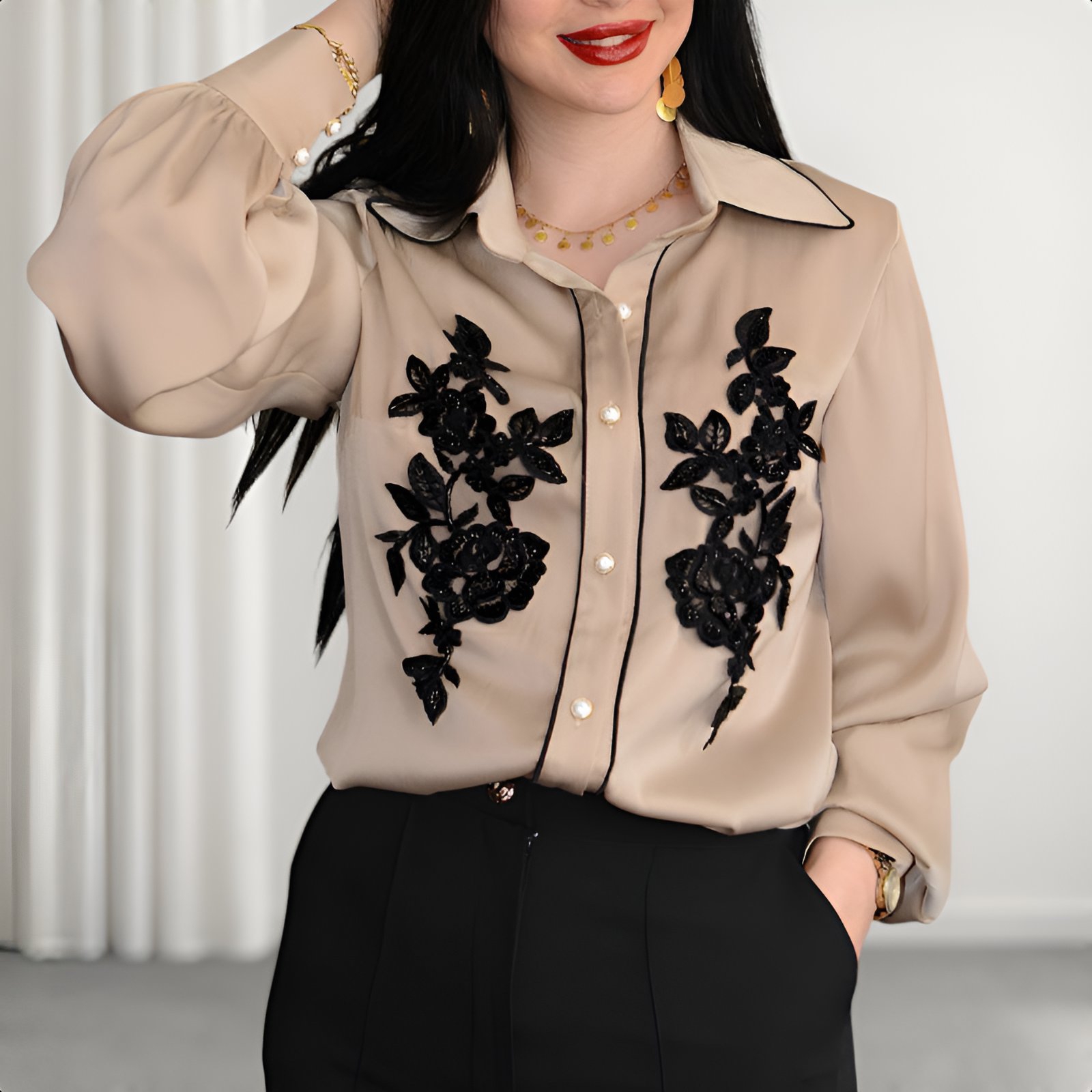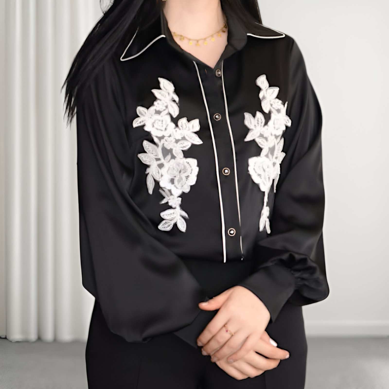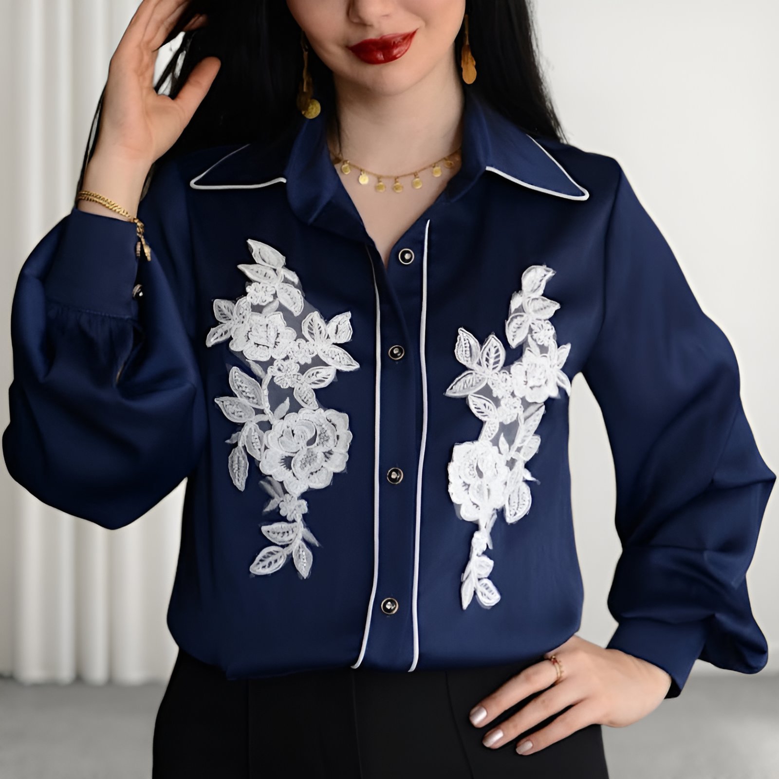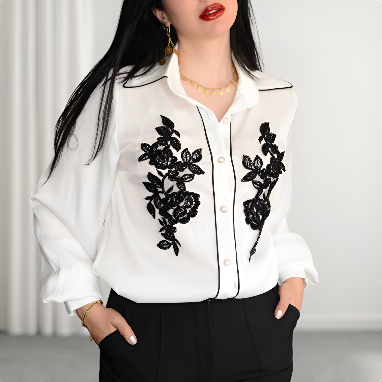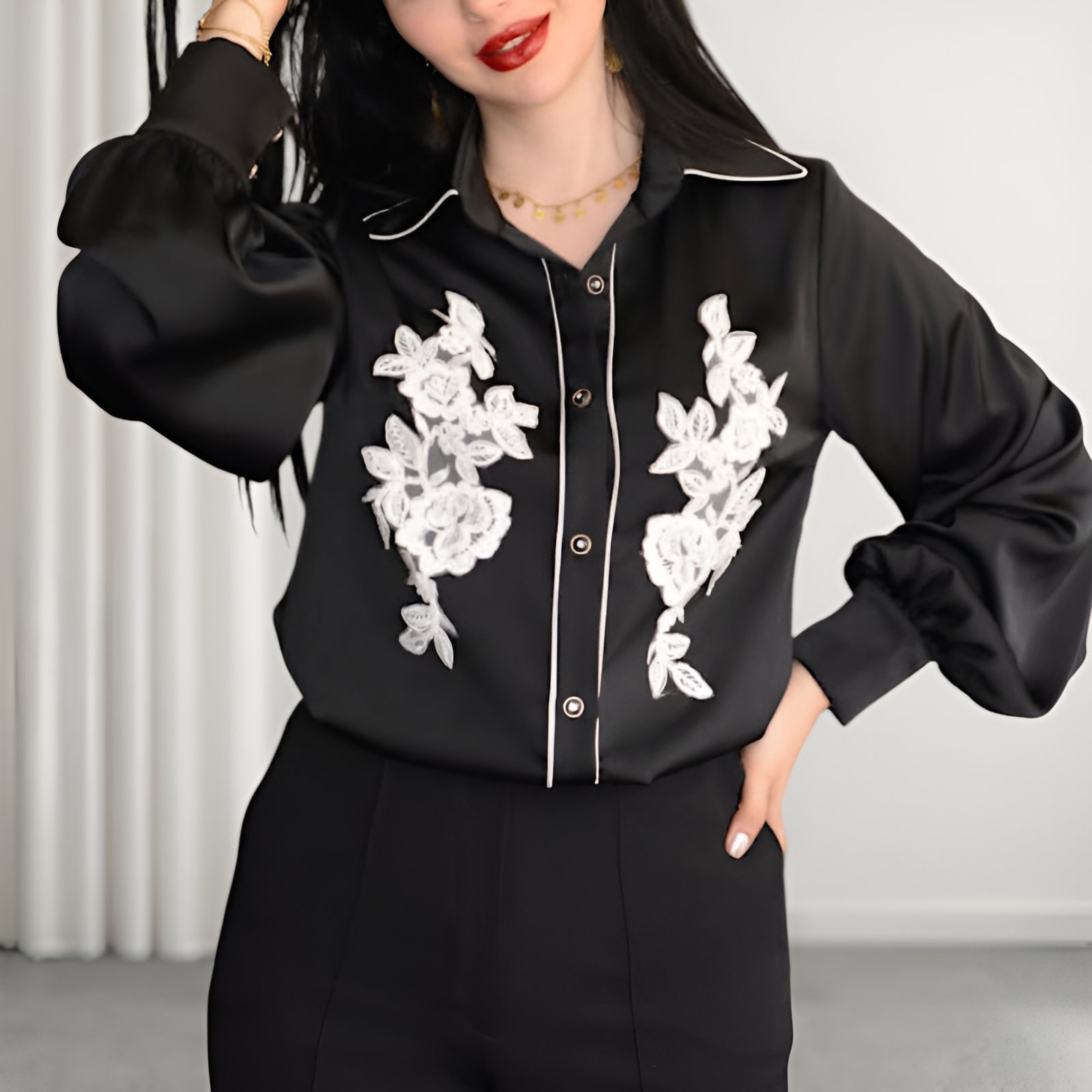 در طراحی شومیز ماهلین از اپلیکه و گلدوزی ظریف گلدار در قسمت جلو استفاده شده که بهصورت کاملاً قرینه کار شده و جلوهای لوکس به لباس میبخشد. این جزئیات ظریف باعث شده شومیز نهتنها ساده و مینیمال نباشد، بلکه در عین شلوغ نشدن، کاملاً چشمگیر و خاص به نظر برسد. یقه کلاسیک و خطوط دوخت تمیز، این شومیز را به انتخابی ایدهآل برای استایلهای رسمیتر تبدیل کرده است. جنس شومیز ماهلین بسیار لطیف، سبک و خوشفرم است و بهخوبی روی بدن مینشیند.