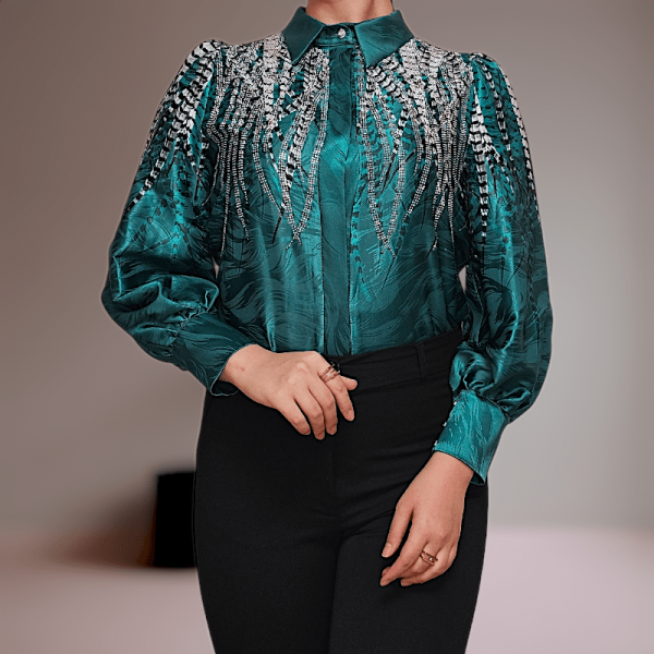 شومیز مجلسی مدرنا با پارچه ساتن و نگینهای DMC بدون ریزش، یکی از لباسهای شیک و لوکس مناسب برای مراسمها و مهمانیهای رسمی است.
